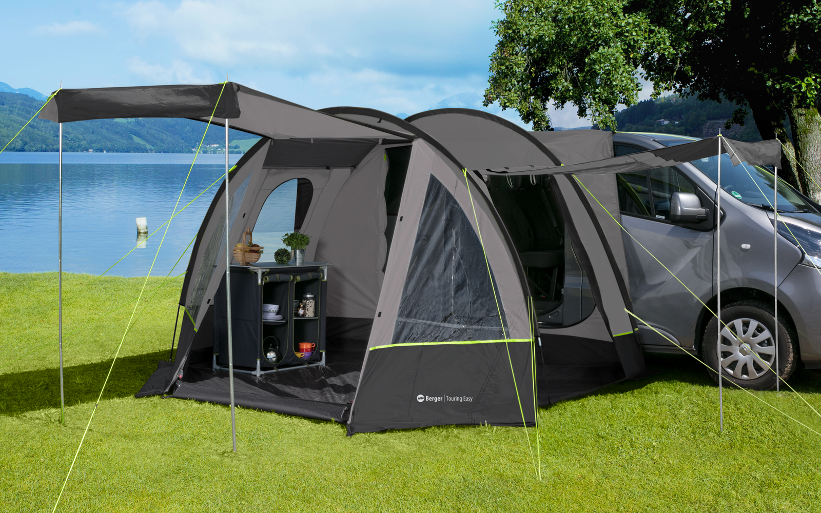 L'auvent Berger Touring Easy convient aux véhicules ayant une hauteur de gouttière de 180 à 200 cm. La hauteur intérieure est de 205 cm. L'auvent de bus est autoportant, ce qui permet de déplacer facilement le véhicule sans devoir démonter l'auvent.