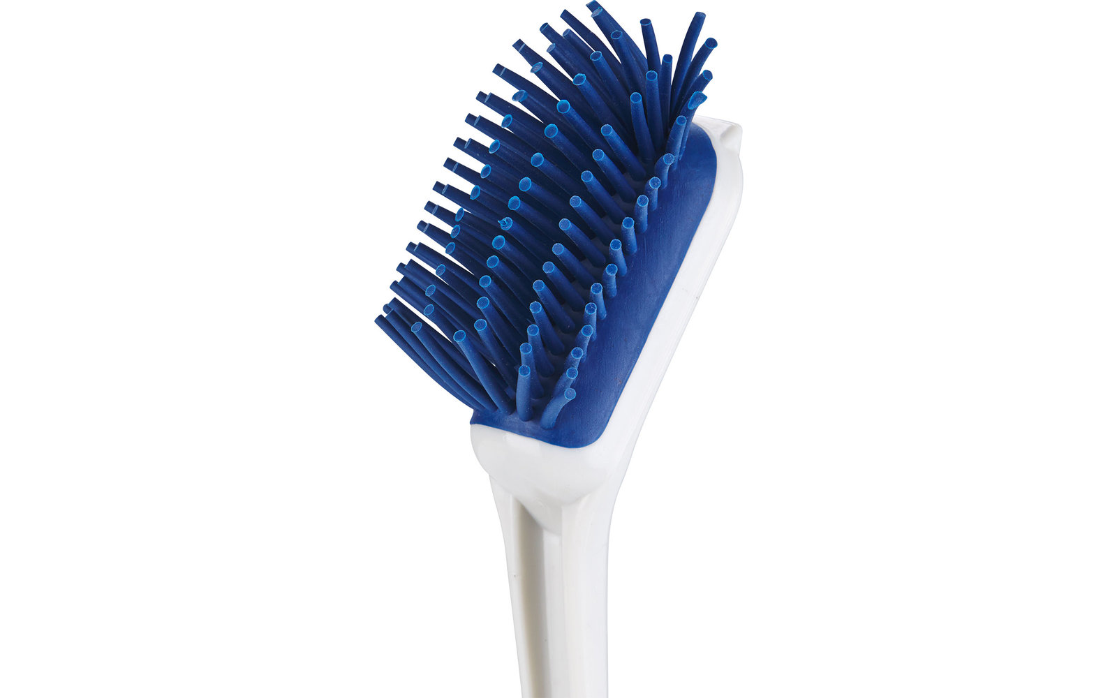 Brosse de toilette compacte avec poils en silicone et support. Pour un montage mural.