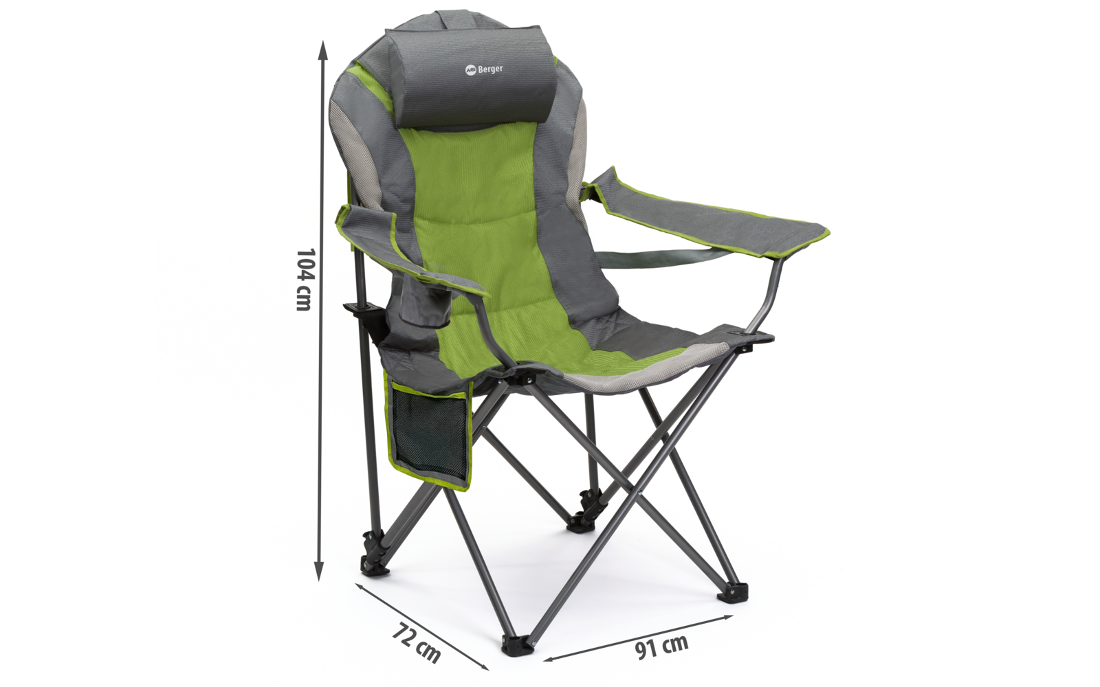 Ce fauteuil pliant avec sa housse rembourrée et résistante (100 % polyester) offre un confort d'assise exceptionnel, encore renforcé par le dossier réglable, le soutien lombaire et le coussin de tête. La chaise dispose également d'un porte-gobelet et d'un organiseur intégré (capacité de charge de l'organiseur : 1,2 kg). L'armature est en acier robuste, revêtu par poudre, de couleur gris titane. Elle peut être facilement pliée et rangée dans le sac de rangement correspondant.