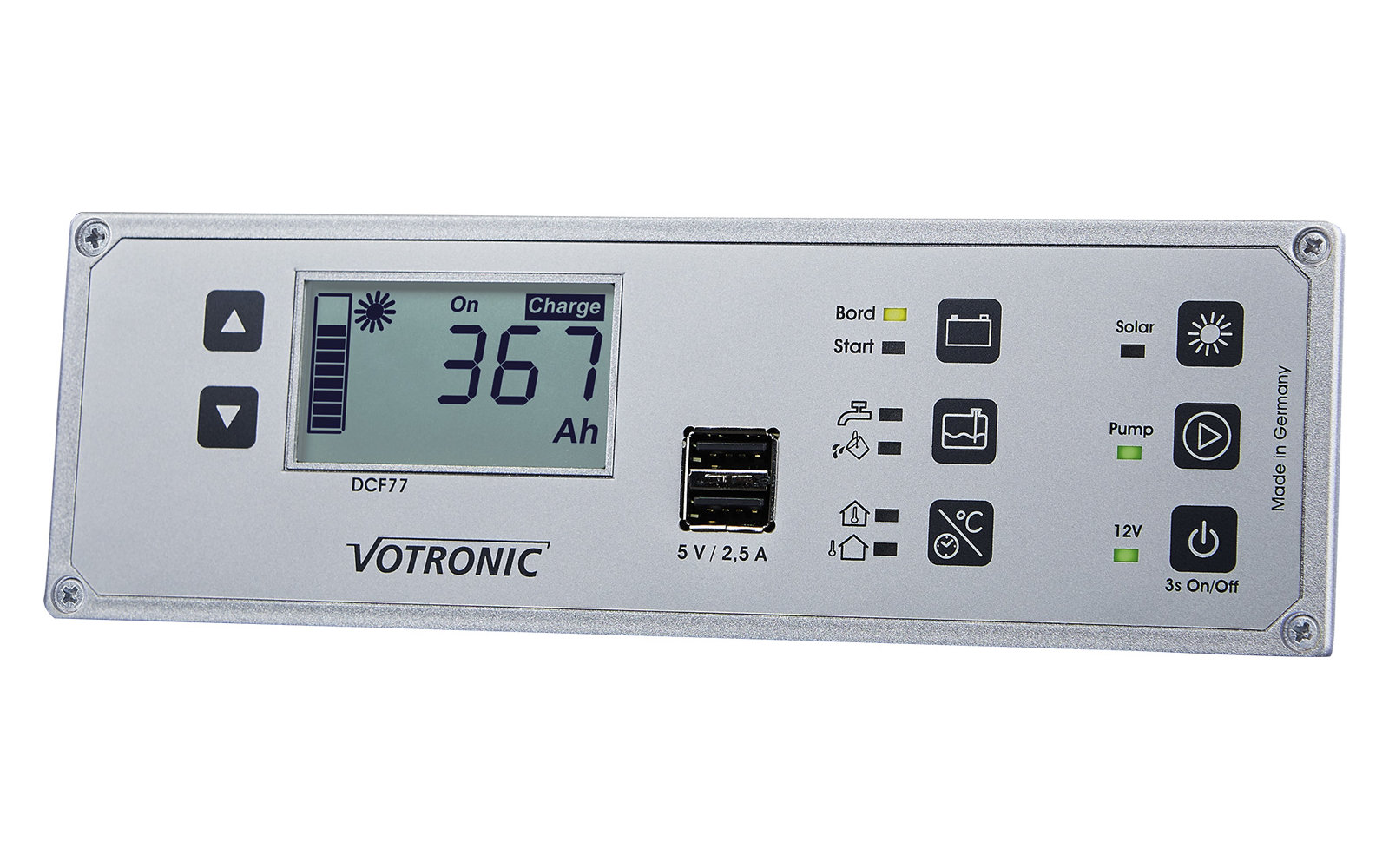 Le VOTRONIC Power Control (en abrégé VPC) est un système multi-panneaux innovant pour les camping-cars, qui réunit les fonctions et les informations les plus importantes en un seul appareil convivial. Les informations sont affichées sur un écran graphique clair et éclairé en blanc. Les valeurs affichées en grand sont parfaitement lisibles dans toutes les conditions d'éclairage, même à grande distance