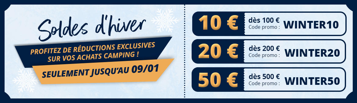 * Sauf pour les articles : gaz, livres, produits Ecoflow et cartes cadeaux. Un seul code promotionnel par client. Offre non cumulable avec d'autres offres ou bons d'achat. La publication du code promotionnel et la divulgation à des tiers est interdit. Valable uniquement sur le site Berger Camping du 07.01.2026 jusqu’à minuit du 09.01.2026.